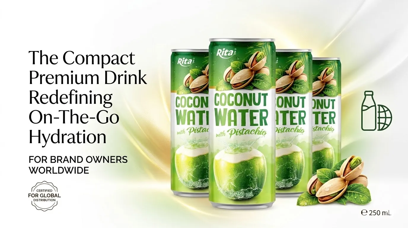 尺寸即策略。在快节奏发展的紧凑型罐装饮料市场中,能够精准匹配产品与消费场景的品牌才能脱颖而出——而250ml细长罐正是现代即饮饮料品类中最具通用性与高周转率的规格。Rita Food & Drink Co., Ltd 通过250ml罐装开心果椰子水,将这一规格优势充分发挥:将天然椰子水的清爽纯净,与开心果独特的坚果醇香相融合,打造出一款兼具便携性、高端质感且支持OEM定制的产品,专为全球快消品饮料市场而设计。